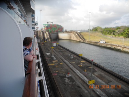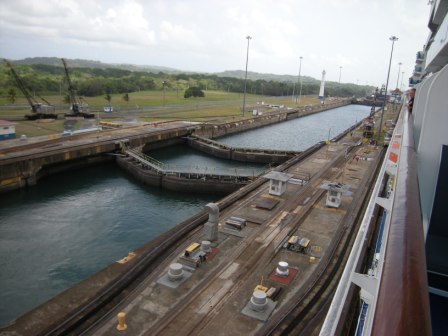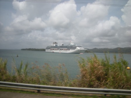 Wednesday we entered the canal from the east and went thru the Gatun Locks. this took several hours and was fascinating when you think about how the canals were constructed 100 years ago. Once we were in Lake Gatun, the people going on excursions boarded the tenders which took them to the waiting buses on shore. While we were on excursions, the ship turned around in the lake and headed back thru the locks to Colon, Panama. Our excursion took us to the Gamboa Rainforest Resort for a boat ride around some islands searching for monkeys, sloths, and other native animals. We did have several Cappuchin monkeys scamper on the bimini cover begging for treats. On the trip back to the ship we passed the prison where Noriega is being held. We were back in Colon, Panama early afternoon and the ship departed at 3:30 pm.
